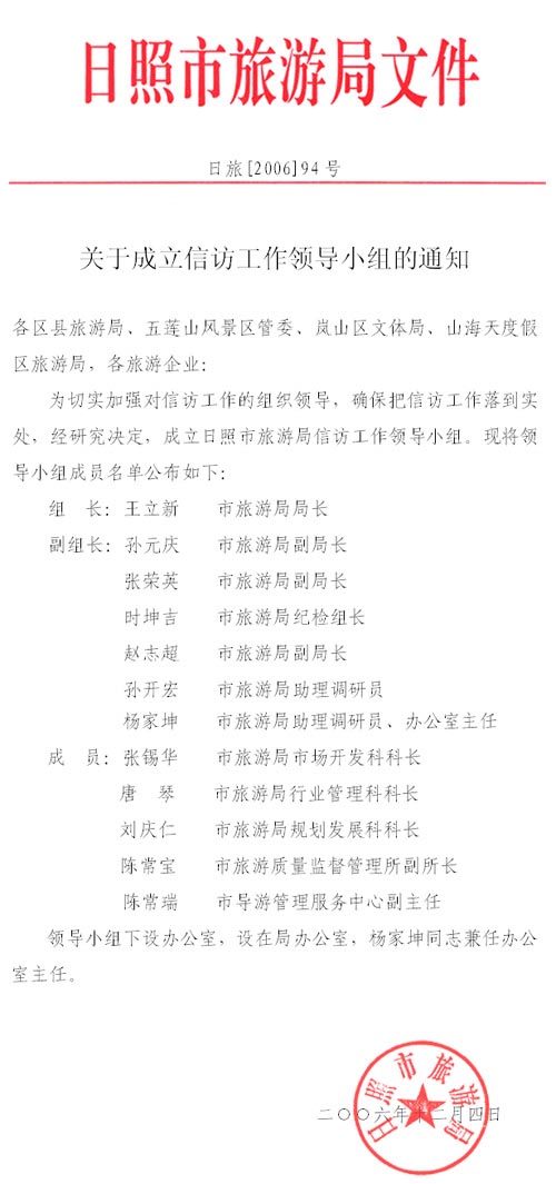 公告 关于成立信访工作领导小组的通知(2006年12月06日)