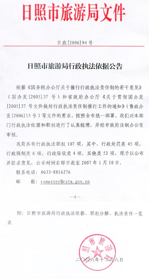 公告 日照市旅游局行政执法依据公告(2006年12月08日)