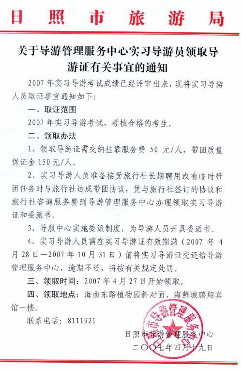 公告 关于导游管理服务中心实习导游员领取导游证有关事宜的通知(2007年04月22日)