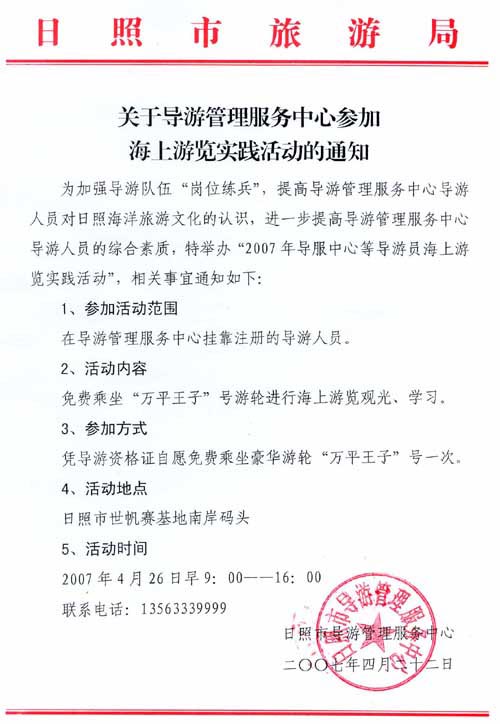 公告 关于导游管理服务中心参加海上游览实践活动的通知(2007年04月22日)