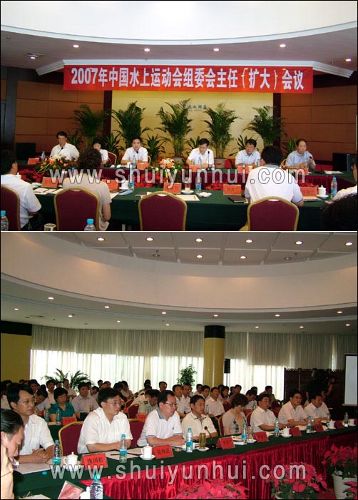 7月4日下午,2007年中国水上运动会组委会主任(扩大)会议在日照碧波大酒店召开。会议对组委会前段时间的各项工作进行了总结,研究部署了下一段的筹备工作任务,并对会旗、会歌、奖杯、奖牌、获奖证书等事项进行了研究审议。国家体育总局竞技体育司副司长郭建军,国家体育总局水上运动管理中心副主任辛群英,驻国家体育总局纪检组、监察局纪检监察室主任阎利生,山东省体育局党组副书记、山东体育学院院长叶国雄出席会议,市委副书记、市长杨军出席并讲话,副市长解世增主持会议。