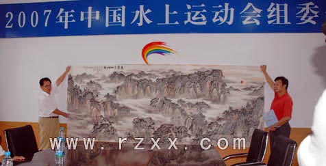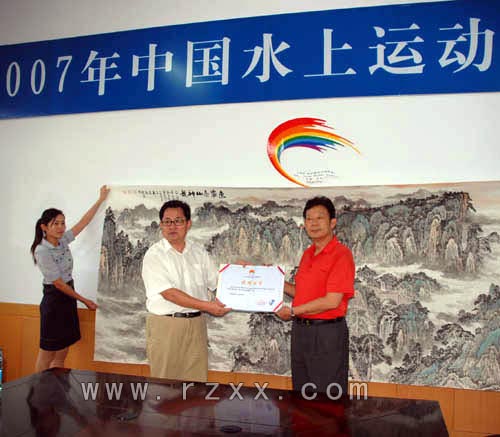 7月20日,书画名家刘万秋先生专程从济南来到日照,向2007中国水上运动会赠送经过两个多月精心构思绘制的画作。该作品长4米,宽1.5米,以泰山神韵为题材,反映了泰山的雄伟壮阔,大气磅礴。刘万秋先生的义举充分体现了他对水运会的关注和支持,也是体育运动与文化艺术联姻的又一生动实例。 20日下午,水运会组委会举行了接受刘万秋先生画作捐赠仪式,市政府及水运会组委会副秘书长黄秀芹同志向刘万秋先生颁发捐赠证书。