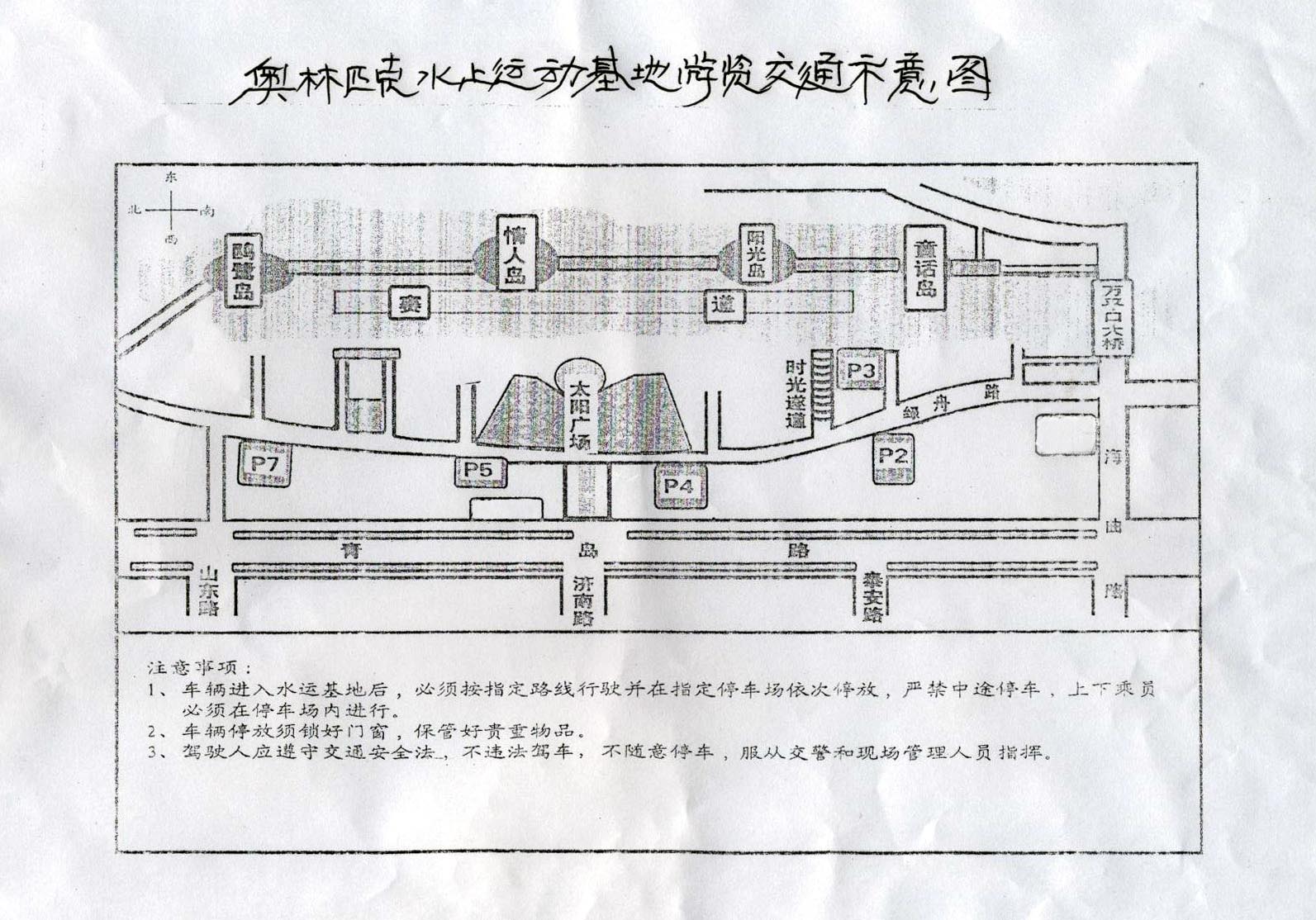 各旅行社: 按市领导的指示,在“十一”黄金周期间推出全新的旅游产品——奥林匹克水上公园,要求各旅行社积极引领游客游览。现就有关事宜通知如下: 一、“十一”黄金周期间,奥林匹克水上公园不收门票,其平面示意图及导游词可在日照旅游政务网上下载(网址:http://www.rzta.gov.cn) 二、音乐喷泉开放时间:20:00—20:30 三、各旅行社严格按示意图道路行驶。各类车辆可从山东路入口进入水上运动基地,济南路入口仅容轿车出入;进入后一律在基地绿舟路行驶,严禁拐入岔道。 四、4号停车场停放中巴车,5号停车场可停中巴、大巴 五、重大事宜可与基地办公室联系。联系电话:0633—8702618 二00七年九月二十九日 附件: 点击下载 导游词 点击下载 奥林匹克水上公园平面示意图