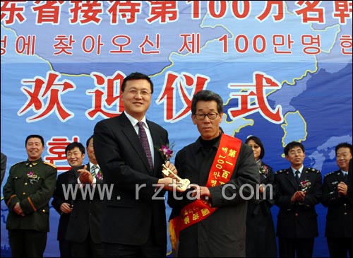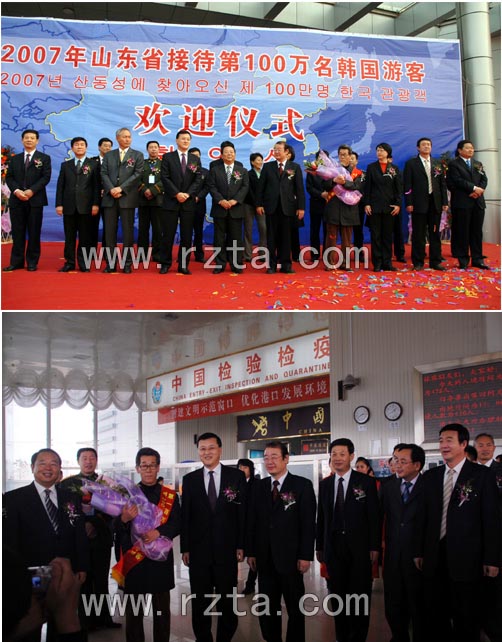 11月29日下午,来自韩国的游客林庆镐刚一踏进日照海关,一份特殊的幸运便不期而至:他幸运的成为2007年来山东省旅游的第100万名韩国入境游客,在此接受了礼仪小姐送上的“2007年山东省第100万名韩国入境游客”绶带和鲜花。
