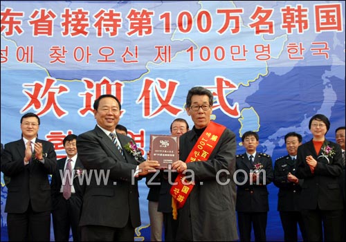 据了解,2005年年接待韩国游客50万人到2007年的100万人,仅用2年的时间,韩国年来鲁游客翻了一番,山东业已成为众多韩国客人出境旅游的首选目的地。山东省第100万名韩国游客林庆镐是由日照碧波国际旅行社接待,林庆镐旅游团一行50多人。