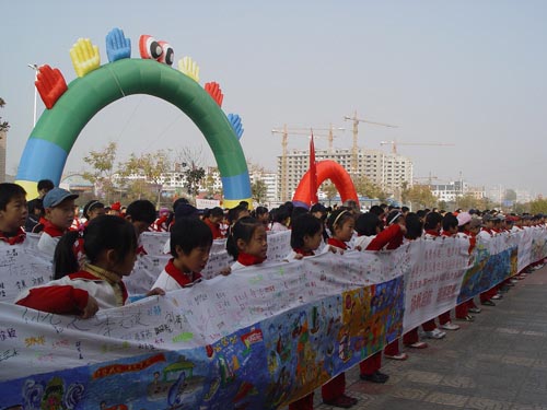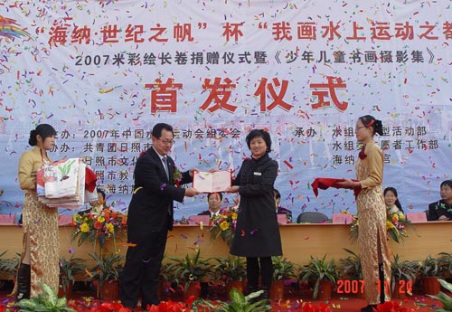 2007年11月24日,几百名身着各色校服的青少年学生、长长的彩绘长卷和雄壮的音乐将海纳少年宫广场装点成一片喜庆欢乐的海洋,“海纳•世纪之帆”杯我画水上运动之都2007米彩绘长卷捐赠仪式暨少年儿童书画摄影集首发仪式在此隆重举行。