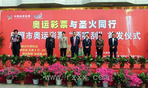3月30日在日照凌云大厦广场隆重举行了奥运即开型彩票在日照市上市首发式。 山东省体育局体彩管理中心主任蒋强,日照市人大常委会副主任梁爱云,日照市人民政府副市长徐清,日照市政协副主席王坤英,日照市体育局副局长丁明春,山东省体彩管理中心日照分中心主任侯建刚出席了首发式。日照市人民政府副秘书长来永明主持仪式。 奥运即开彩票率先在山东省上市,共有7种玩法,首批亮相的有“好运中国”,“勇争第一”,“奥运金牌”,“激情•梦想”,“加油中国队”5种。奥运彩票票面设计涵盖奥运比赛项目、火炬传递路线、奥运福娃、中国参加历届奥运会所获成绩等内容,不同的系列和风格将奥运精神和即开彩票的独特魅力有机结合起来,具有收藏价值和纪念意义。 奥运彩票玩法设计更加多样化、更具趣味性,一张彩票有多次中奖机会,奖级多,返奖率达65%;彩票面额3元、5元、10元不等,最高奖金达25万元。 百年奥运,万众期盼,携手奥运,共赢金彩。奥运彩票不但给广大群众中奖和娱乐机会,也满足了大家“参与奥运,支持奥运”的美好愿望,成为大家“支持北京奥运”的重要方式。 奥运彩票与奥运圣火同行,奥运彩票将和奥运会互相辉映,成为中国彩市一道靓丽的风景线。