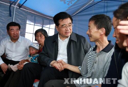 5月16日下午,中共中央总书记、国家主席、中央军委主席胡锦涛在受地震灾害严重的四川省绵阳市北川县擂鼓镇胜利村看望受灾群众。 新华社记者鞠鹏摄