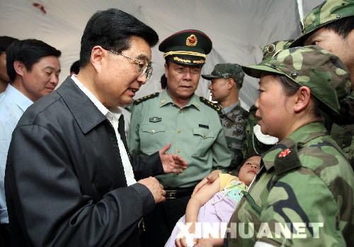 5月16日,中共中央总书记、国家主席、中央军委主席胡锦涛驱车赶赴受灾严重的绵阳市北川羌族自治县,看望慰问受灾群众,指导抗震救灾工作。这是胡锦涛在设在北川中学的野战医疗所里,叮嘱医护人员照看好在地震中失去母亲的3岁女童罗梦夕。 新华社发