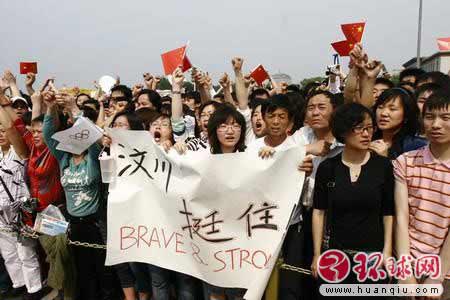 5月19日,民众的天安门广场高举“汶川挺住”的标语。 环球时报记者张思扬摄