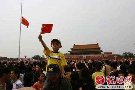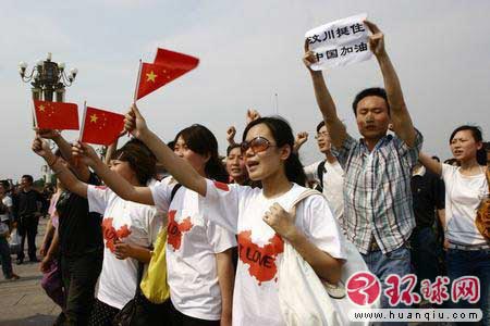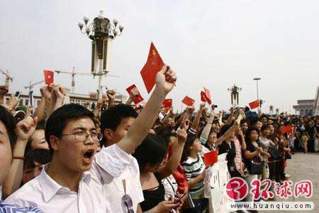 5月19日,民众在天安门广场高呼“中国加油”、“汶川挺住”等口号。 环球时报记者张思扬摄