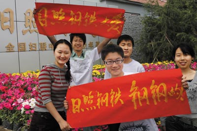 山东日照钢铁控股有限公司继首次向灾区捐款1亿元后,近日又救助117名灾区孤儿来日照读书。这一系列勇担社会责任的善举博得了社会各界的喝彩。 6月15日上午,大学城几十名大学生自发来到灾区学生入住的“安康家园”,抒发了他们对日钢人救灾济孤的仰慕之情。 ( 通讯员 范为祝 摄)