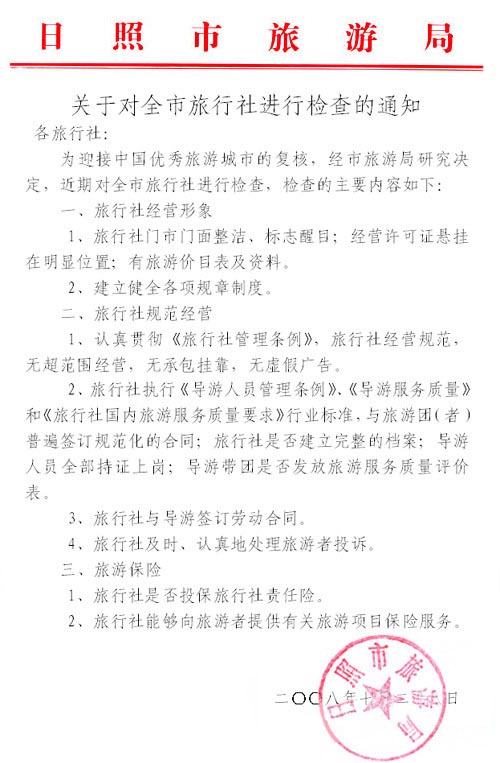 公告 关于对全市旅行社进行检查的通知(2008年07月28日)