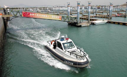 4月27日,在日照世界帆船赛基地,一艘刚刚运抵日照的橡皮艇从十一届全国运动会宣传横幅边通过。 当日,山东省公安边防总队6艘橡皮艇和2艘巡逻艇运抵日照。这6艘橡皮艇 和2艘巡逻艇曾于2008年北京奥运会期间参与青岛赛区的海上安保工作,这次将协同日照市公安边防支队及相关部门为日照赛区提供安全保障。 至此,第十一届全国运动会日照赛区海上安保工作全面展开。第十一届全国运动会将于2009年10月在山东举办,日照市将承办帆船、帆板、赛艇、皮划艇、激流回旋等项目的比赛。