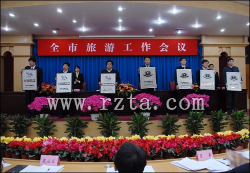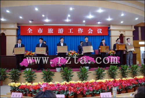 会上表彰了2008年度全市旅游先进集体和先进个人,出席领导分别为2008年度山东省旅游强乡镇东港区涛雒镇、莒县夏庄镇,08年度山东省旅游特色村五莲靴石村,08年被评为AAAA级景区的万平口风景区和日照海滨国家森林公园,新评为AAA级景区的磴山风景区、竹洞天风景区授牌。