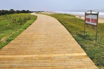 “阳光海岸整治一期工程”中的木栈道工程,南起万平口生态公园北界,北至太公一路南,全长2900多米。这项投资500多万元的工程,自4月18日开工以来,2000多米的标准段已铺装完成,4个在建广场衔接处的木栈道正在紧张的施工中。据阳光海岸南段整治办公室工作人员介绍,木栈道建设使用了从芬兰进口的优质防腐木材。施工建设中,充分体现了保护生态的原则,不采用大开挖方式,而是采用了枕梁式施工方式,保护了周围环境。木栈道离地面留有10公分左右的空间,既利于沙生植物生长,又给爬行动物留出了通行空间。木栈道全面建成后,方便游客观光、休闲,也为海边增添了又一处美丽的风景。