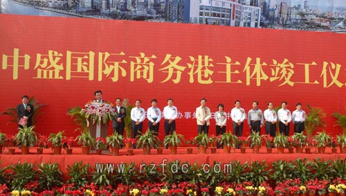 10月16日,中盛国际商务港隆重举行封顶仪式。日照市人大常委会第一副主任周惠平,日照市委常委、东港区委书记张永霞,日照市副市长刘西良,日照市长助理、市建委主任董淑波,日照港集团总经理蔡中堂,中盛集团董事长、总经理张建等领导出席本次封顶仪式并讲话。东港区区委副书记、区长郑加贵主持仪式。