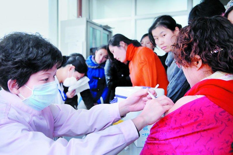 11月10日,来自全市各大医院的医护人员正在市疾控中心接种甲型H1N1流感疫苗。据了解,11月9日至17日,全市将完成第一期甲型H1N1流感疫苗接种,共接种疫苗4万余支。疫苗接种工作分三期进行,第一期优先安排的对象为:口岸检疫、海关一线工作人员、公共交通、高速公路、汽车站一线服务人员,托幼机构教职工,中小学生,一线医疗卫生人员及慢性病患者。