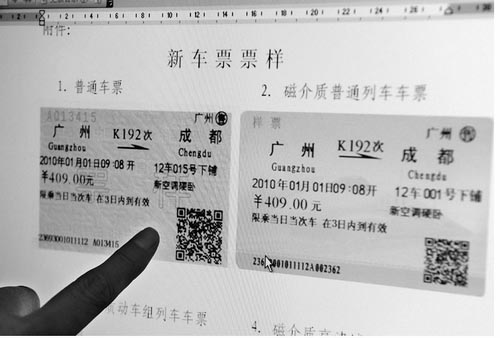 工作人员在介绍车票下方的一维防伪条码将变成一个二维的防伪图案,防伪功能有所加强。2009年12月10日起,铁道部对计算机车票(含磁介质车票)票样将进行修改,原车票正面一维条码改为二维条码,但列车及车站到达补票系统车票不变。新旧车票过渡期截止到2009年12月31日。