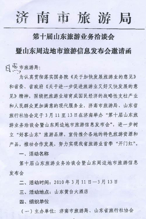 各旅游企业: 3月11至13日,济南市旅游局、山东省旅行社协会联合主办的“第十届山东旅游业务洽谈会暨山东周边地市旅游信息发布会”将在山东黄台大酒店举办,济南市旅游局给我市发出诚挚的邀请(详见附件),请有意参加的旅游企业于3月9日前将名单报市旅游局市场科,于3月12日14:00前到山东黄台大酒店报到。 附:第十届山东旅游业务洽谈会暨山东周边地市旅游信息发布会邀请函
