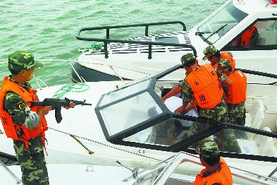 8月23日,日照市边防支队举行2010年中国水上运动会海上反恐演习。演习假设2名可疑人员携带爆炸装置,驾驶一条快艇,全速驶入日照世帆赛基地港池,欲实施破坏活动。正在执行海上警戒任务的两艘公安边防快艇立即对目标船实施控制,对可疑分子实施抓捕,并缴获爆炸装置1组。通过演习检验执勤人员应急、快速反应能力,以提高水运会安保参战部队处置突发事件的整体水平。图为边防官兵正在对可疑人员实施抓捕。