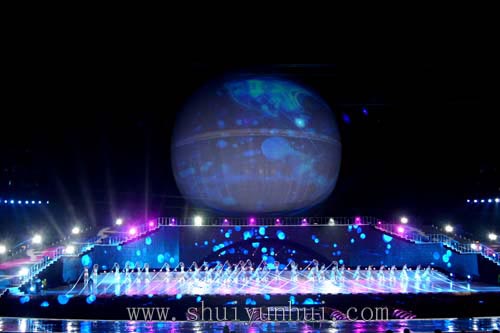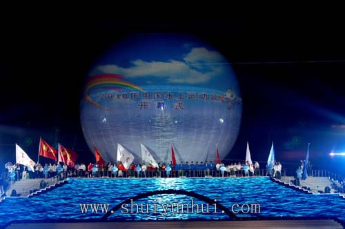 2010年中国水上运动会开幕式将于28日晚在山东日照举行。27日晚上,开幕式彩排在日照奥林匹克水上公园举行,这是一场激情浪漫的盛会。