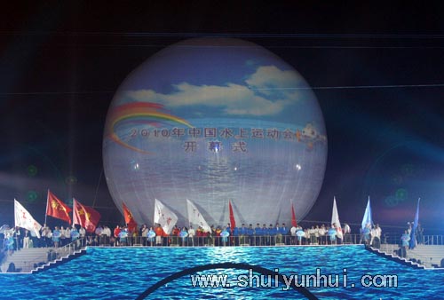 全国人大常委会原副委员长曹志宣布2010年中国水上运动会开幕。音乐起,礼花燃放,中心舞台周围呈现出五彩缤纷的喜庆气氛。大型文体表演《舞动蔚蓝》幕拉开帷幕。
