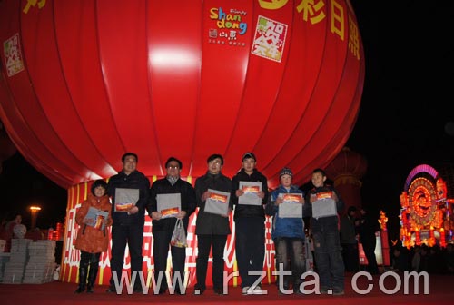 为配合做好全市元宵灯会工作和“好客山东、多彩日照”贺年会收尾工作,满足人们的精神文化需求和祈福求祉的愿望,增强元宵佳节欢乐祥和的氛围,日照市旅游局在第一展区市政府广场中心位置搭起了16米×16米的大舞台,扎起了直径12米的大灯笼,每天19:00开始“抢福”游戏,从2月15日起到18日止,共4晚5场,为好客山东贺年会增光添彩的同时,为市民和游客献上新年浓浓的祝福。