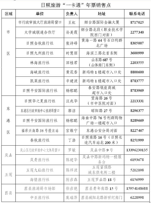 日照旅游“一卡通”景区年票自2009年4月实施,已运行近两年的时间,这项惠民政策在市委市政府的高度关注下,在旅游部门的努力下,稳步实施,扎实推进,健康发展,得到了越来越多市民的认可。2011年将继续实施这项惠民政策。新购单人卡每张60元、亲情卡每张100元。到期年审的给予优惠,单人卡50元,亲情卡80元。市民持年票一年之内可不计次数游览11个景区:日照海滨国家森林公园、刘家湾赶海园、竹洞天风景区、丁肇中祖居、龙门崮风景区、五莲山风景区、九仙山风景区、李崮寨风景区、浮来山风景区、马亓山风景区、磴山寨风景区。全市共设18个销售点,市民可持身份证、户口簿等到销售点购买或办理年审。咨询电话8816289、8717025。 旅游“一卡通”景区年票管理办公室 二〇一一年三月七日