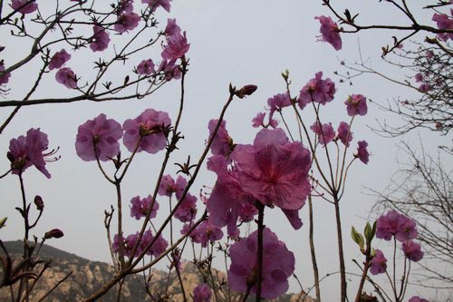 据了解,野生杜鹃俗称映山红,在五莲山生长区域非常广泛,总面积约有一万多亩,其品种之多,面积之广,花色之丽,誉冠华北,素有“江北第一”杜鹃园之称。五莲山杜鹃花色各异,因品系不同,开花的时间也各不相同,自阴历三月份,粉紫色的"蓝锦"品系,就争相开放。“五一”时节,可见漫山遍野簇簇鲜花,流光溢彩,磬香袭人,与山光石景相映衬,宛如天然画卷。此时,赴山赏花的游人如织,但见花海人潮,游人似梦如醉,如入仙境。