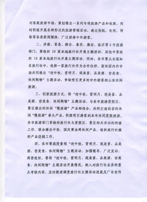 各旅行社: 中秋佳节即将到来,为组织更多的中外游客到我市休闲旅游,按照省旅游局《关于组织旅行社企业积极开展“迎中秋、赏明月、观美景、品美酒、尝美食、休闲购物”主题活动的通知》(鲁旅发[2011]120号)的要求,经研究决定,在全市范围内由开展“迎中秋、赏明月、观美景、品美酒、尝美食、休闲购物”主题活动,各旅行社按照省旅游局文件精神,各自组织好中秋旅游产品线路的设计与促销,并将开展活动和宣传促销的情况与9月5日上午12时前报市旅游局市场科。 附:《关于组织旅行社企业积极开展“迎中秋、赏明月、观美景、品美酒、尝美食、休闲购物”主题活动的通知》(鲁旅发[2011]120号) 二〇一一年九月二日