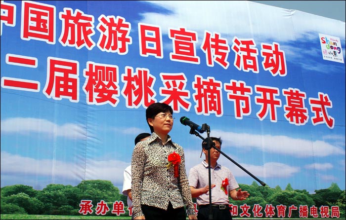 日照市旅游局党组副书记、副局长张荣英宣布日照市5•19中国旅游日宣传活动启动,五莲县第二届樱桃采摘节开幕
