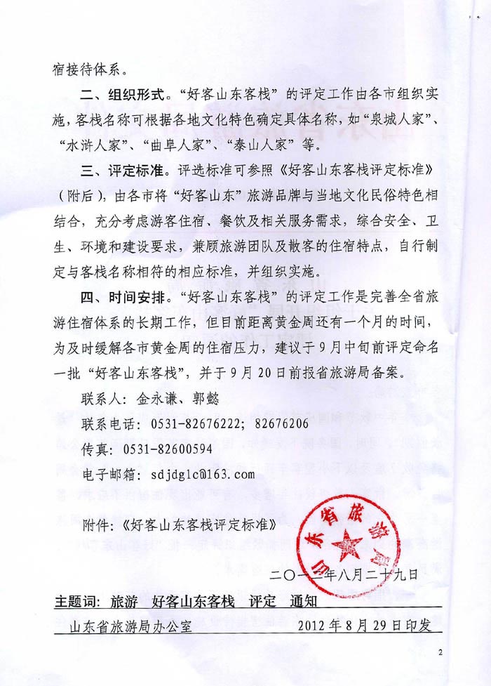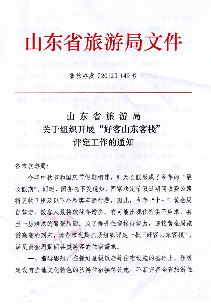 关于转发山东省旅游局《关于组织开展“好客山东客栈”评定工作的通知》的通知(2012年09月07日)