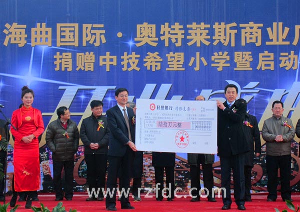 仪式上,海曲国际奥特莱斯商业广场捐赠给日照市陈疃镇中技希望小学60万元人民币。