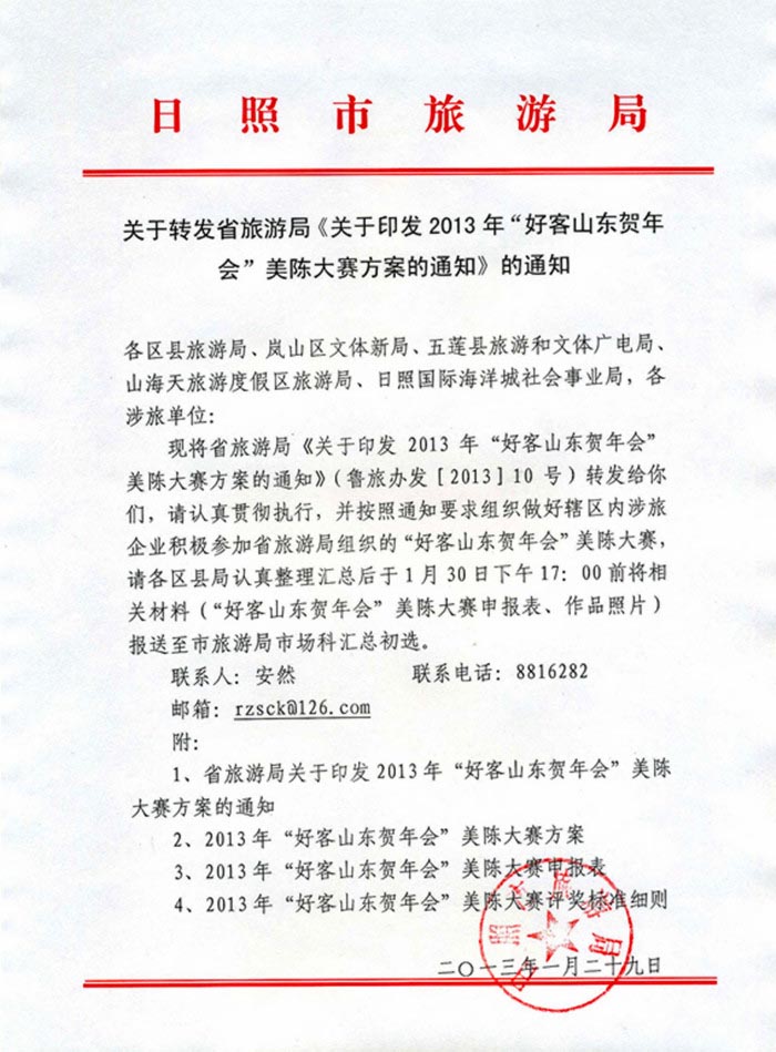 关于转发省旅游局《关于印发2013年“好客山东贺年会”美陈大赛方案的通知》的通知(2013年01月29日)
