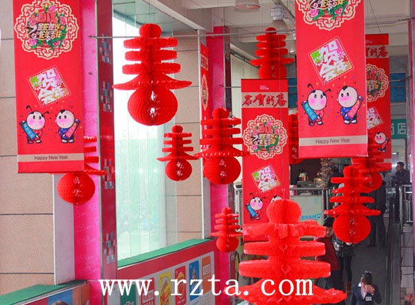 进入二楼超市,各条主通道主要是以“金蛇贺岁”的主题平面设计版面和大红灯笼为主的“年货一条街”主题吊挂,春节的气氛浓郁,效果突出,是本次美陈设计的亮点。
