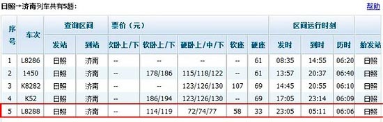 济南至日照列车共有5趟,硬座33元 从中国铁路客服网获悉,今年“五一”小长假期间,日照至济南增发两次列车,硬座票价仅为33元。 据悉,今年的“五一”小长假定为4月29日至5月1日。记者从中国铁路客服网查询获悉,4月28日至5月1日期间,日照至济南增发L8287和L8288两次列车,日照济南区间列车达到每天5列。 增发的两次列车中,L8287次列车是由济南发往日照,下午15时自济南发车,22时10分到达日照,历时7小时10分。L8288次列车是由日照发往济南,23时5分发车,次日早5时11分到达济南,历时6小时6分。 另外,考虑到季节气温,增加的两次列车均为非空调车。两车全程硬座票价仅33元,软座票价58元,硬卧票价分别为72元、74元、77元,软卧票价为114元和119元。票价分别是现有日照至济南列车票价的二分之一。