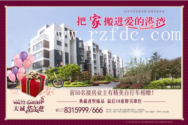 有爱才是家,天诚·华尔兹让您把家搬进爱的港湾。为了感谢购房业主对天诚的信任与支持,前50名接房业主可获赠天诚·华尔兹为您准备的精美自行车。典藏叠墅臻品,最后10席即买即住,期待您的选购。 天诚·华尔兹位于日照市山海天旅游度假区,北临太公岛二路,西临山海天路,山东省日照一佳学校以北,项目定位于旅游度假高尚生活社区,倾注全新设计理念,构筑名流尊贵府邸。项目总用地面积为70842㎡(106.3亩),用地性质为商住,规划总建筑面积为97000㎡,容积率1.3,覆盖率30.9%,绿化率40%。 天诚·华尔兹由24栋住宅楼组成,产品有花园洋房、公寓、多层、小高层、叠拼别墅。住宅总建筑面积82000㎡,约870户;地下车库建筑面积33000㎡,停车位820辆;商业建筑面积9600㎡,公建475㎡。 咨询热线:0633-8315666 8315999