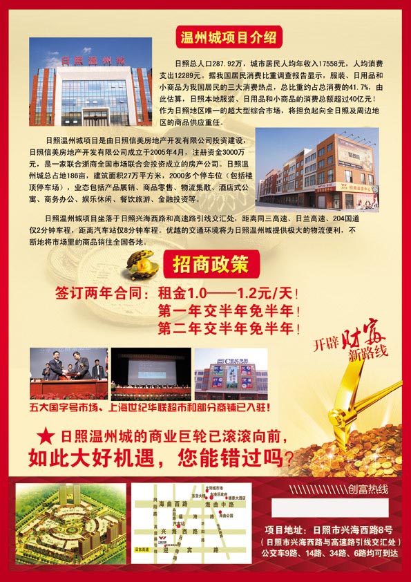 日照·温州城的商业巨轮已滚滚向前,如此大好机会,您能错过吗? 日照•温州城是山东省日照市政府招商引资,由浙江温商投资,日照信美房地产开发有限公司开发建设,2009年重点推出的大型综合物业项目,位于日照市兴海路与高速路入口引线交汇处,雄踞西北,东南望海,占地186亩,是集休闲娱乐、旅游购物、办公研发、展销交易、物流批发及酒店式公寓为一体的综合型豪布斯卡式国际小商品城。