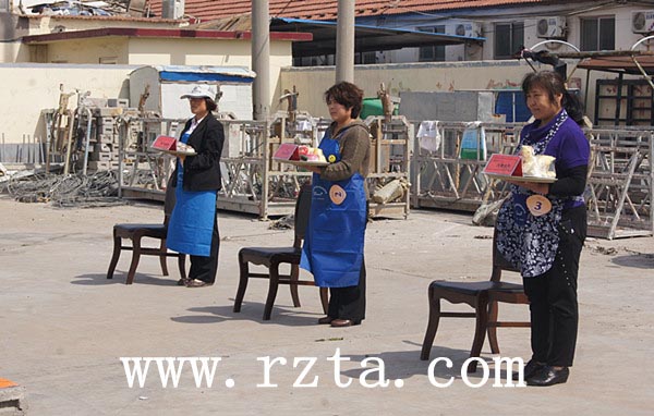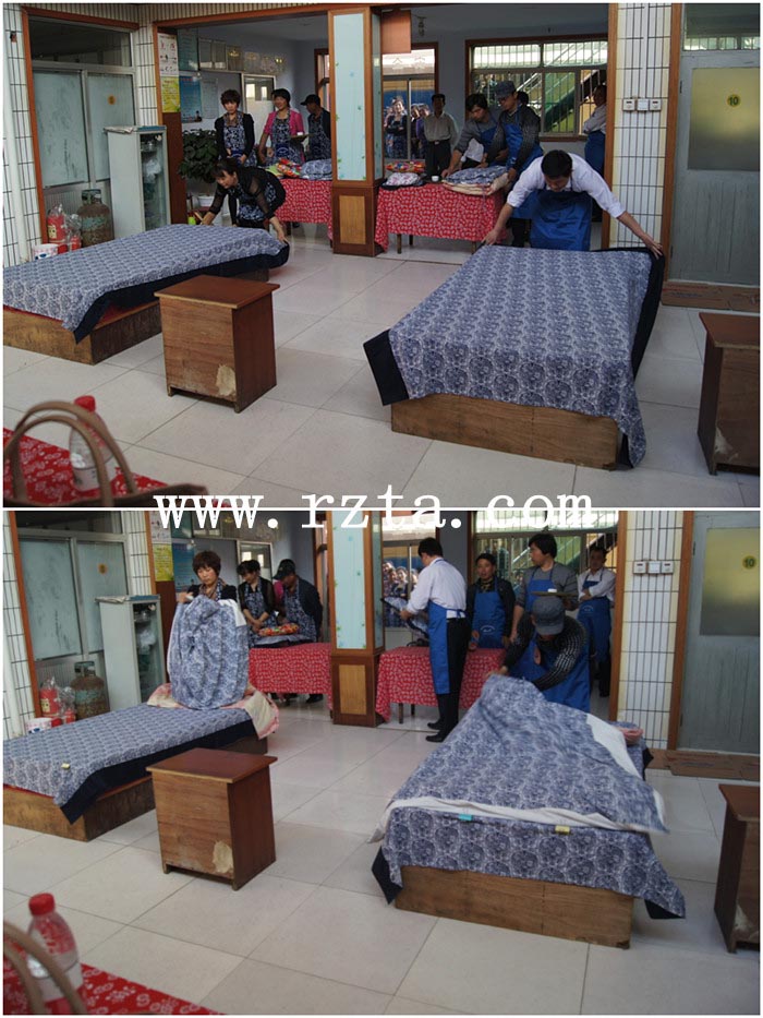 据拓普联合学校秦校长介绍,参加本次考试人员所穿的服饰、考试物料都是由学校提供,在面料花色的选择上,充分考虑民俗旅游村所接待的客户群体的特点,最大限度的让旅客能够有耳目一新的感觉。客服服务技能的考核,每四人一组,从甩单、被套、枕头、渔家饰品的摆放,最后的茶水服务,一切明确分工,有条不紊。考场如火如荼。