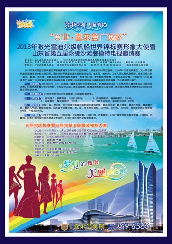近日,记者从日照广播电视台获悉,“兴业·喜来登广场杯”2013年激光雷迪尔级帆船世界锦标赛形象大使暨山东省第五届泳装、沙滩装模特电视邀请赛将于8月24至25日在日照市激情开赛。 据了解,本次大赛是2013日照电视艺术节的系列活动之一,是由山东省电视艺术家协会、2013年激光雷迪尔级帆船世界锦标赛组委会主办,日照广播电视台和日照市电视艺术家协会承办,山东省17城市广播电视台联办,我集团独家冠名协办。7月至8月,山东省17城市广播电视台分别举办初赛,选出的前3至4名代表所在城市参加在日照的总决赛。日照市选拔赛将于7月底举办,分别设少儿组、青年组比赛,比赛评出帆船少儿宝贝奖,青年组优秀选手代表日照参加总决赛。总决赛将从8月24开始,比赛内容主要包括自我推介、参赛感言,泳装、沙滩装展示,日照水运知识、帆船知识问答等,大赛设冠、亚、季、军奖暨帆船宝贝奖、最具风采奖、最上镜奖、最具活力奖、最具潜力奖、最具人气奖、最佳形象奖、山东省十佳模特奖。冠、亚、季军分获奖金:6000元、5000元、4000元;单项奖分别获得奖金700元,十佳奖500元。