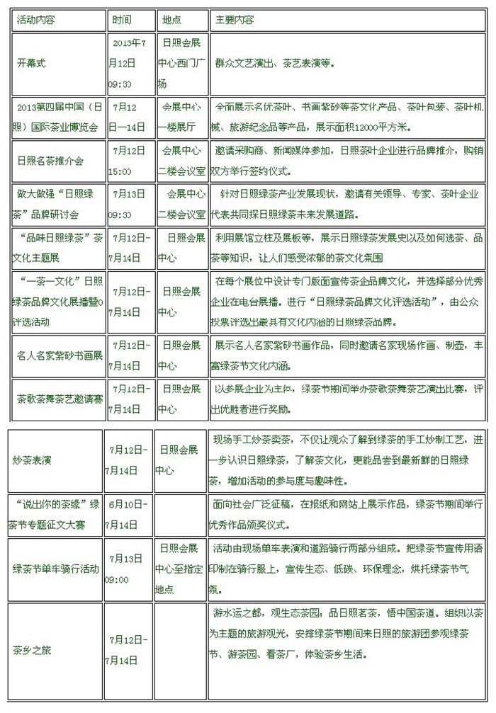 第四届绿茶节活动预览表(2013年07月04日)