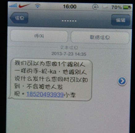 7月23日市民王女士向记者反映,自己经常收到"复制电话卡可窃听他人电话……"的短信。关于克隆电话卡窃听对方电话内容的新闻报道有很多,市民的警觉性也在不断提高,但是不法分子仍然在挖空心思开拓新市场。 家住日照新市区的王女士因为工作原因,每天需要拨打大量的电话以及收发很多短信,如果手机被窃听,将会导致商业机密以及个人隐私泄露。 为了解情况,记者特意按照发短信人提供的电话号码打过去,号码显示为广东广州,一个李姓的女子接听了电话:"客户只要提供想要监听人的手机号码,我们就能在两天内复制好这个手机号码。复制的手机卡不但能监听,还可以接收被复制手机的通话和短信。"当记者问及复制卡的技术是否成熟时,对方回答:"我们掌握尖端技术,这个可以放心。而且我们从08年就开始做这行,有很多的顾客。"据李女士介绍,复制一张卡的成本需900元,有专门的公司工作人员联系客户,货到付款。当记者询问日照是否有工作人员时,李女士表示,全国各地都有,我们的公司范围很广。 公民的通信自由和通信秘密受法律保护,除因国家安全或者追查刑事犯罪需要,由公安机关或检察机关依照法律规定的程序对通信进行检查外,任何组织或个人不得以任何理由侵犯公民的通信自由和通信秘密。因此,不管出于任何目的,一般公民去窃听他人手机内容,都属于侵犯他人的通信秘密,是违法行为。 关于克隆电话卡窃听对方电话内容的新闻报道有很多,权威机构以及公安部门多次向市民提醒,但是这样的非法行为仍然存在。