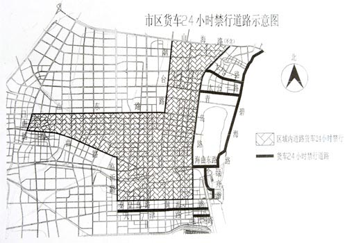 市区货车24小时禁行道路示意图 记者从交警部门获悉,大货车的限行范围又扩大了。除部分路段实行时间限制外,有些路段24小时严禁大货车通行,目的是为了进一步提高城市管理水平,优化交通环境,保障道路交通安全。 限行道路扩大,要求更严格 据悉,在日照市区大货车24小时限制通行的主要是:日照路(含)以东、青岛路(含)以西,黄海一路(含)、秦皇岛路(含)、临沂路(含)和海曲路(含)连线以北以东,山东路(含)、烟台路(含)、山海路(不含)连线以南以东区域内道路及海曲东路(青岛路至万平口段)、绿舟路、碧海路(万平口至山海路段)、太公一路、太公二路、天津路(临沂路以东段)、连云港路(海滨一路至海滨二路路段)。 对于其余路段则实行时间限制,每天7:00至23:00是不允许大货车通行的。限行车辆因工程建设、生产经营等必须在管制时段内驶入限行区域的,可申请办理通行证或临时通行证,按照通行证所规定的时间、路线通行。此次限制车不含工程抢险车、道路养护车、洒水车、垃圾清运车、道路清扫车、护栏清洗车、吸污车。 市民多赞同,货车司机有忧愁 记者通过调查发现,对于此项政策的出台,大多受市民表示赞同,但有些货车司机却乐不起来。市民老赵说:“市区的道路增长比不上车流的增长,限制大货车进入市区主干道势在必行,有利于促进城市发展和管理;利于市民上下班与出行顺畅;可防止重型货车对市区主干道的损坏和堵塞;可加快向大城市建设发展,建立健全城市周边大型货物集散中心或市场。” 市民小张说:"不允许大货车进城是很有必要的,因为现在的大货车个头都赶上火车皮了,占用道路空间大,上下班高峰期堵塞特别明显,要是在交叉路口它一转身,那整个路口就是它的天下了,使整个城市的节奏变慢,还加剧了城市的空气污染。" 对此政策,货车司机王先生表示了担心,他说:"我是大货车司机,每天都要拉货,因为有时间限制,这才利用晚上的时间干活,但是现在如果24小时限制我们大货车通行。这就要求我们得转路,增加了运输成本和时间。这样一来我的收入就少了。"