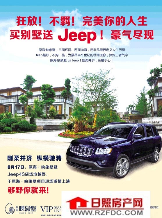 原海·映象墅——狂放!不羁!完美你的人生; 买别墅送Jeep! 刚柔并济,纵横驰骋!8月17日,原海·映象墅Jeep4S店场地越野,与于原海·映象墅项目现场激情上演,够野你就来! 相关链接: 原海映象,位于日照市东港区涛雒镇刘家湾村海滨,以第一排的绝版地段,屹立于北中国海最壮丽的海滩之滨。与日照的其他海滩不同的是,原海映象位于的刘家湾赶海园片区,是一片原海,位置得天独厚,公园即在家门口,无与伦比的参与度,塑造罕见的真正公园住宅。