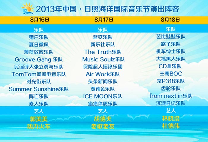 2013中国·日照海洋国际音乐节嘉年华部分已经接近尾声,“重头戏”2013中国.日照海洋国际音乐节将于8月16至18日上演,重量级艺人杜德伟、林晓培、胡德夫、动力火车和老歌老友乐团等两岸一线歌手以及30组中外著名乐队将倾情演出,众星云集,唱响一夏。