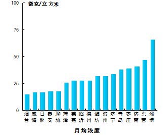 7月份,细颗粒物浓度最好的城市是烟台,为42μg/m3,最差的城市是德州,为85μg/m3。