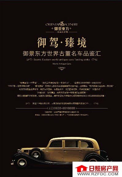 御景东方——御驾·臻境!世界古董名车品鉴汇! 相关链接: 御景东方是日照芳州置业历经3年,重金铸造的滨海豪宅典范项目。项目位于日照市城市主干道海曲东路北侧、烟台路东侧,距市政府500米,沿海曲东路1500米直抵万平口生态风景区,周边众多大型商业环抱,商业氛围浓厚,生活配套齐全。占据新市区CBD中央核心区,近享城市中央繁盛,远观浩瀚碧海蓝天,地理位置极其优越。