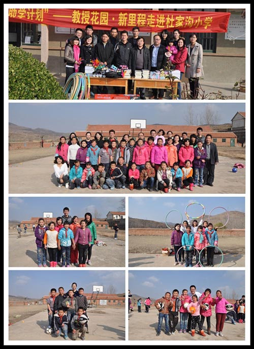 11月22日,位于五莲县街头镇的杜家沟小学热闹非凡,山海天城建集团“萤火虫助学行动”首站活动在这里启动。没有鲜花和掌声,没有领导讲话和华丽的开场白,迎接我们的是一张张质朴笑脸。我们给孩子们带来了篮球、足球、排球、羽毛球、跳绳、毽子、呼啦圈和学习用品。教授花园新里程的业主们也参与了此次助学活动,并为孩子们带来了体育用品和学习用品。简短的赠品交接仪式后,我们来到了学校操场,与孩子一起上体育课。山东体育学院的汤老师作为我们活动的志愿者,为孩子们准备了一场快乐丰富的体育课:老鹰捉小鸡、篮球传递、踢毽子、跳绳等。