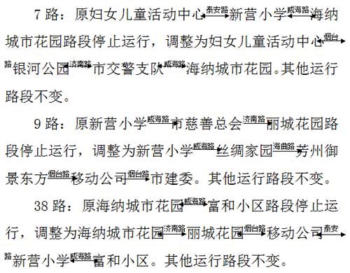 记者从日照市公交公司获悉,12月13日起,威海路与淄博路路口施工,将致使威海路(泰安路~济南路段)公交车辆无法正常通行,途经该路段的7路、9路、38路临时绕行。 据了解,自施工之日(12月13日)起,将途经该路段的7路、9路、38路临时绕行济南路、烟台路、泰安路,待施工结束后再恢复原线路运行。现将调整路线公布如下: